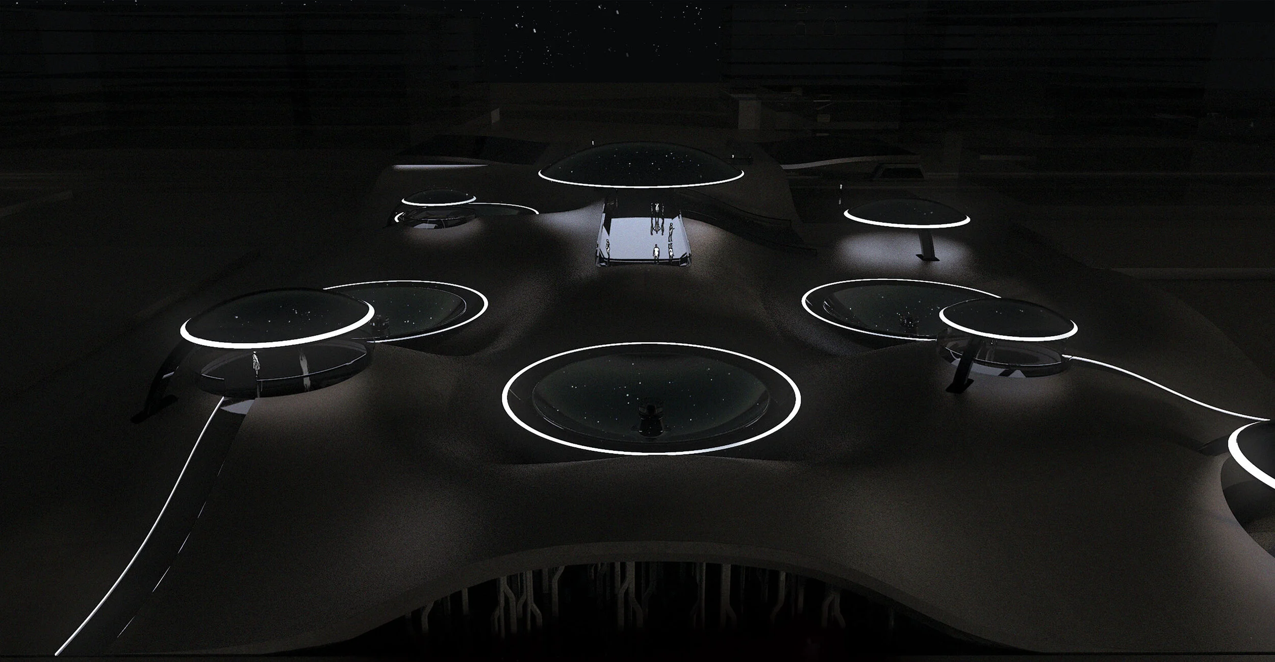As the temperature drops and sun diminishes, Ecotone transforms into a peaceful nightscape. As the solar collectors have generated and stored power during the day, they now become moving mirrors reflecting the night sky. Well lit shelters become places for meeting up with friends and family, as well as vantage points from which to observe the cosmic mirrors.